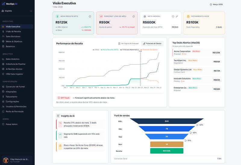 Transforme os dados do seu CRM em receita previsível. A RevOps AI conecta com HubSpot e RD Station para entregar diagnósticos de funil, forecast matemático, análise de pipeline e Revenue Playbooks para times de vendas e RevOps.